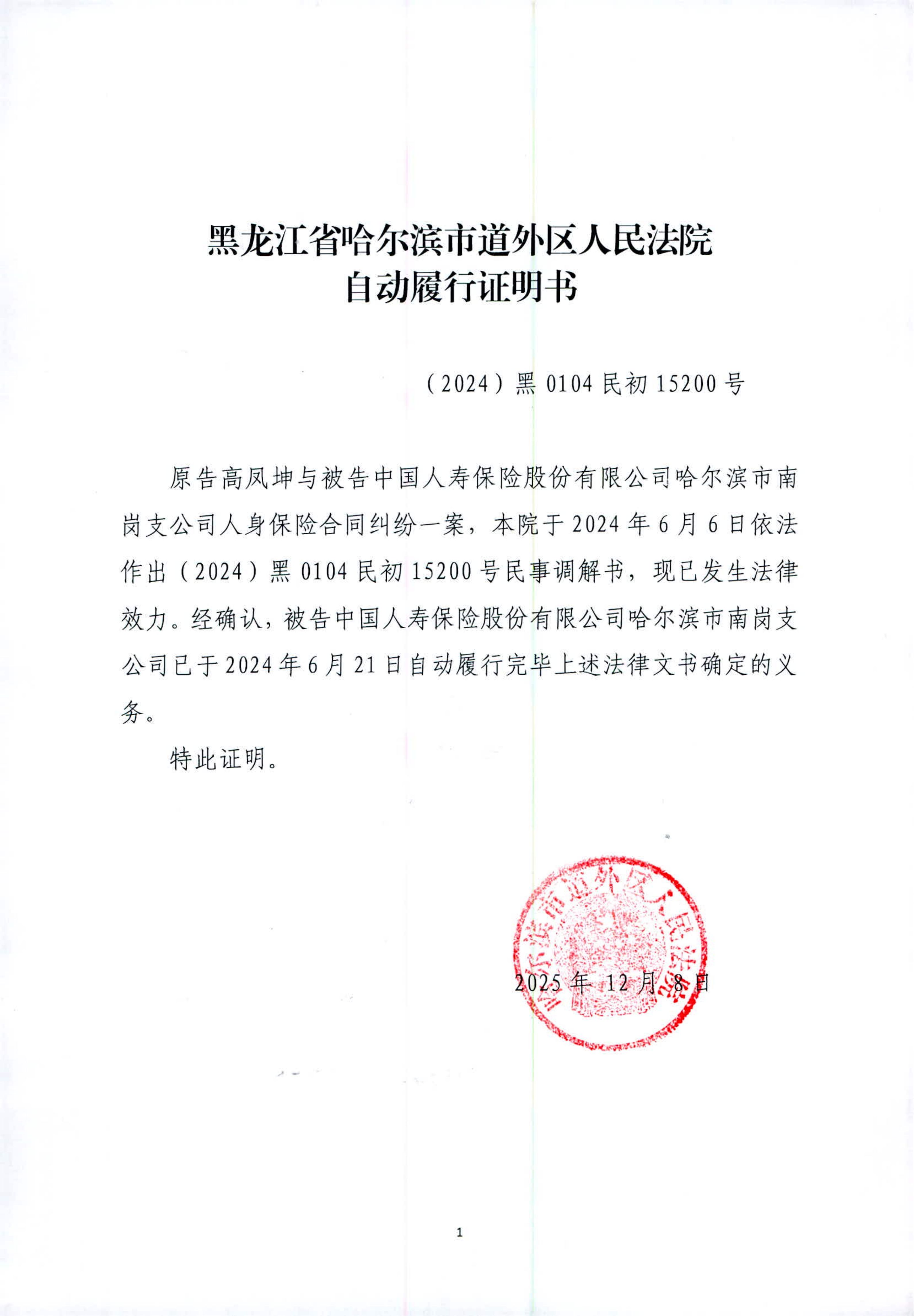 原告高凤坤与被告中国人寿保险股份有限公司哈尔滨市南岗支公司人身保险合同纠纷一案自动履行证明书